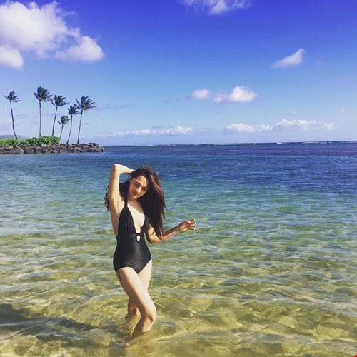Khi hoà mình vào khung cảnh lãng mạn của bãi biển đẹp nhất nước Mĩ, Bảo Anh không ngại khoe vóc dáng gợi cảm, nóng bỏng với trang phục bikini quyến rũ.