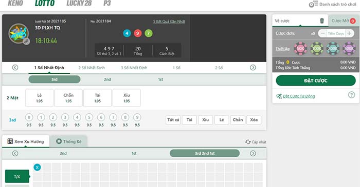 | Ba số cuối | TÀI / XỈU / LẺ / CHẴN là những lựa chọn của người chơi. Khi thứ 3, thứ 2, thứ 1 chữ số của kết quả phải phù hợp với lựa chọn, người chơi giành chiến thắng.