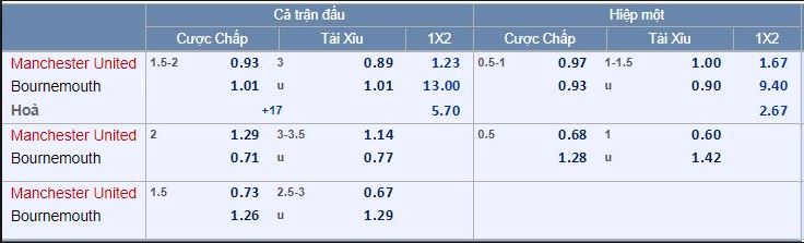 Trong trận đấu ở trên MU sẽ đối đầu với Bounemouth. MU có lợi thế sân nhà và thực lực được đán giá cao hơn đối thủ rất nhiều khi nhà cái đưa ra tỉ lệ MU chấp kèo Bounemouth là 1.5-2( 1 3/4) trái