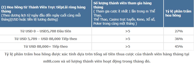 Hiếm có nhà cái nào có tỉ lệ ăn chia hoa hồng cho đại lý cao như nhà cái M88. Theo đó, mức hoa hồng mà một đại lý của nhà cái này có thể được nhận lên tới 45%.