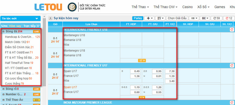 Letou hỗ trợ người chơi cá cược ở phần lớn các trận đấu lớn nhỏ không giống nhau như giải Ngoại Hạng Anh, giải Laliga Tây Ban Nha, giải Bồ Đào Nha… người chơi có thể chọn trận đấu bóng đá và đội bóng mình yêu thích để tham gia cá độ.
