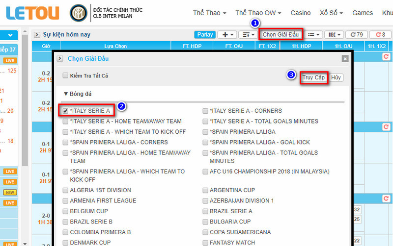 Sau khi xác định trận đấu muốn đặt cược, tại giao diện Letou, bạn hãy chọn như hình ảnh bên dưới.