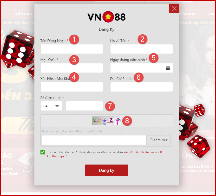 Các thông tin mà hệ thống VN88 yêu cầu người chơi cung cấp, bao gồm: tên đăng nhập hay còn gọi là nickname sẽ là tên của bạn khi xuất hiện tại các trận cá cược, họ tên thật (tên trùng với tên của chủ tài khoản ngân hàng hoặc ví điện tử), mật khẩu đăng nhập, ngày tháng năm sinh thật, địa chỉ email và số điện thoại. Nhà cái VN88 cam kết bảo mật các thông tin cá nhân cũng như thông tin tài khoản ngân hàng của người chơi, tuyệt đối không tiết lộ cho bên thứ 3, vì vậy, bạn hoàn toàn có thể an tâm khi cá cược tại VN88.
