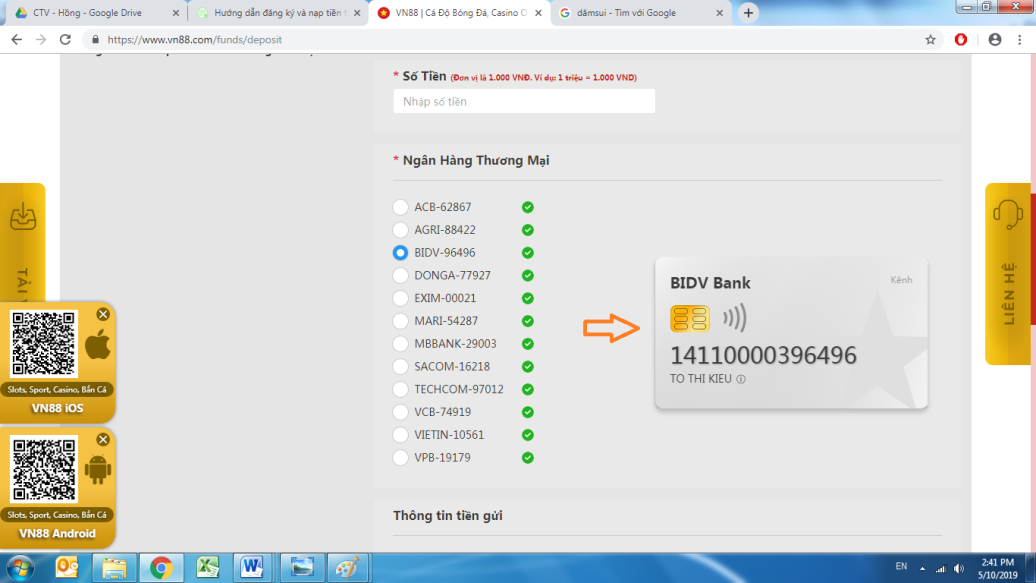 Nhà cái VN88 hiện có tài khoản ở hầu hết các ngân hàng lớn tại Việt Nam như BIDV, Đông Á, Techcombank, VCB, … nên người chơi dễ dàng chọn được ngân hàng mình muốn giao dịch. Người chơi có thể chọn một trong các phương thức sau ATM, internet banking, Mobile banking, gửi tiền mặt tại quầy ngân hàng hay gửi tiền tại cây ATM. Thông thường phương thức được sử dụng nhiều nhất là Internet Banking