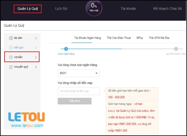 Đối với những người đã thực hiện rút tiền nhiều lần thì hệ thống Letou không yêu cầu người chơi phải cài đặt mật khẩu rút tiền. Riêng với giao dịch rút tiền lần đầu tiên thì hệ thống sẽ hiển bảng thông báo cài đặt mật khẩu nhằm tăng tính bảo mật tài khoản. Việc này rất hữu ích trong trường hợp người chơi bị đánh cắp thông tin và dù đối tượng lừa đảo đã đăng nhập vào tài khoản thì cũng không thể rút được tiền nhờ tính năng bảo vệ 2 lớp này.
