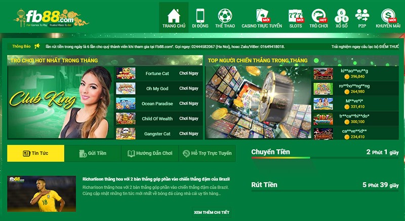 FB88 nhờ vào phương thức hoạt động kinh doanh chuyên nghiệp , các giao dịch hiển thị chi tiết, rõ ràng. Các chương trình khuyến mãi siêu khủng như tặng tiền thành viên mới, hoàn trả tiền cược cho người trơi hàng tuần, quà tặng dịp lễ như là phần thưởng may mắn tặng khách hàng.