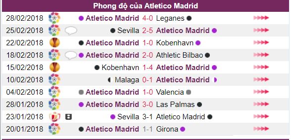 - Thành tích thi đấu gần đây của Atletico Madrid được đánh giá khá cao với 8 trận thắng, 1 trận hòa và 1 thất bại trong 10 trận thi đấu gần đây.