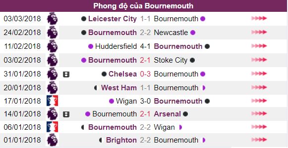 - Phong độ của Bournemouth khá ổn với 3 trận thắng , 5 trận hòa và 2 trận thua trong 10 vòng đấu gần đây