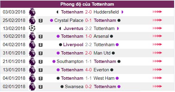 - Trong khi đó với 5 trận thắng, 4 trận hòa và 1 trận thua trong 10 trận thi đấu gần nhất trên mọi đấu trường. Phong độ thi đấu của Tottenham được đánh giá khá ổn khi so sánh với đối thủ