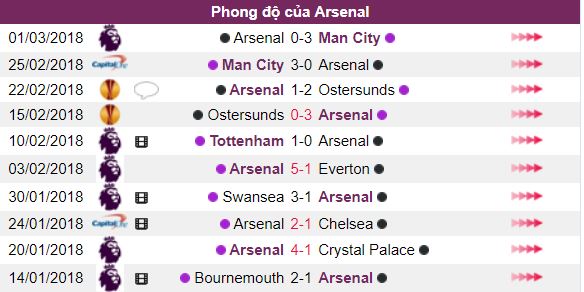 - Phong độ của Arsenal không được đánh giá cao khi để thua đến 6 trận và dành chiến thắng 4 trận còn lại trong 10 trận thi đấu gần nhất.