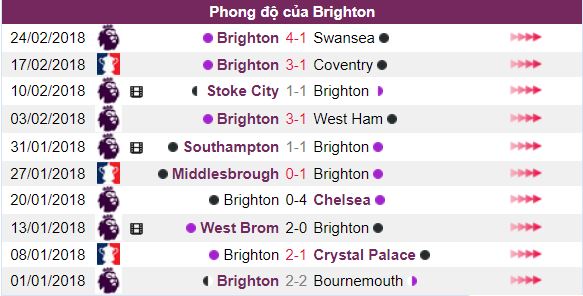 - Với 5 trận thắng, 3 trận hòa và 2 trận thất bại trong 10 trận liên tiếp phong độ thi đấu của Brighton khá ổn định ở thời điểm này.
