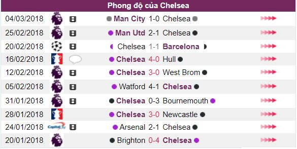 - Với vai trò đội chủ nhà Chelsea thi đấu khá tốt khi để thua 1 trận, thắng 3 trận và cầm hòa 1 trận trong 5 trận gần đây.
