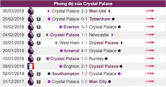 - Trong khi đó với 2 trận thắng, 3 trận hòa và 5 trận thua trong 10 trận thi đấu gần nhất trên mọi đấu trường. Phong độ thi đấu của Crystal Palace không được đánh giá cao từ giới chuyên gia.