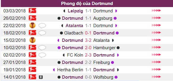 - Thành tích thi đấu gần đây của Dortmund khá ổn định với 4 trận thắng, 6 trận hòa và 0 có thất bại nào trong 10 trận thi đấu gần đây.