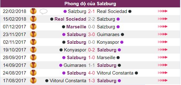 - Trong những trận thi đấu xa nhà gần đây phong độ thi đấu của Salzburg tạm ổn khi dành được 2 chiến thắng, 1 trận hòa và để thua 1 trận trong 4 trận thi đấu trên sân khách gần nhất