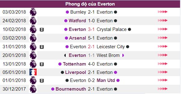 - Thành tích thi đấu gần đây của Everton không được đánh giá khá cao với 2 trận thắng, 1 trận hòa và 7 thất bại trong 10 trận thi đấu gần đây.