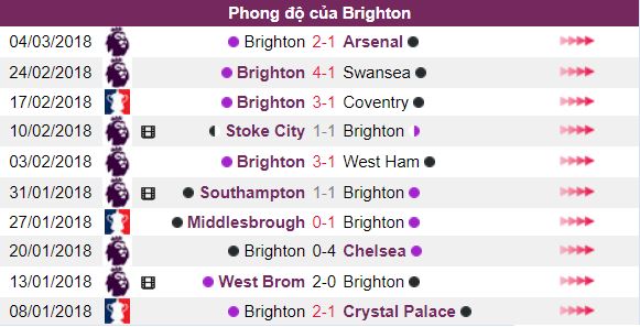 - Trong khi đó với 6 trận thắng, 2 trận hòa và 2 trận thất bại trong 10 trận liên tiếp, phong độ thi đấu của Brighton được đánh giá cao khi so sánh với đối thủ.