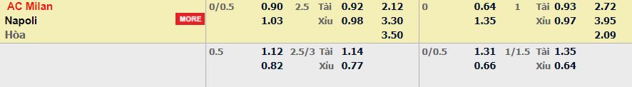 - Mức kèo nhà cái cược chấp trận này: AC Milan chấp 0,25 Trái. AC Milan ăn 0,90. Napoli ăn 1,03