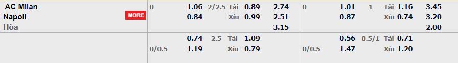 - Mức kèo nhà cái cược chấp trận này: Hòa – Được – Thua. AC Milan ăn 1,06. Napoli ăn 0,84