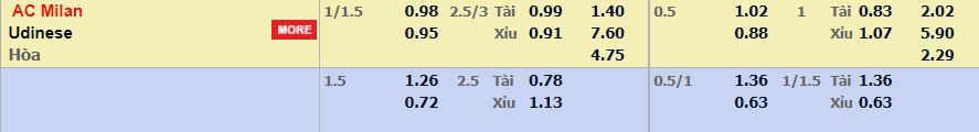 - Mức kèo nhà cái Fun88 tỷ lệ cược chấp trận này: AC Milan chấp 1,25 Trái. AC Milan ăn 0,98. Udinese ăn 0,95