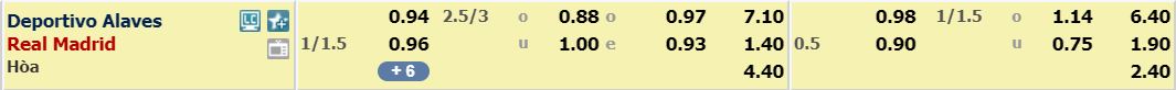 - Mức kèo bóng đá cược chấp nhà cái đưa ra cho cả trận: Real Madrid chấp 1,25 Trái. Alaves ăn 0,94. Real Madrid ăn 0,96.