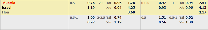 - Mức kèo nhà cái đưa ra trận này: Áo chấp 0,5 trái. Áo ăn 0,76. Israeal ăn 1,19