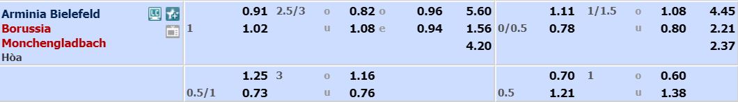 - Mức kèo nhà cái cược chấp trận này: Monchengladbach chấp 1 trái. Arminia Bielefeld ăn 0,91. Mongchengladbach ăn 1,02