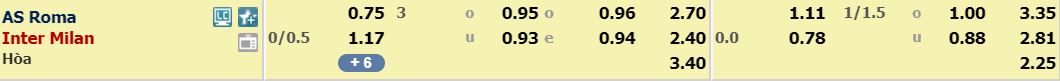 - Mức kèo nhà cái cược chấp trận này: Inter Milan chấp 0,25 trái. AS Roma ăn 0,75. Inter Milan ăn 1,17