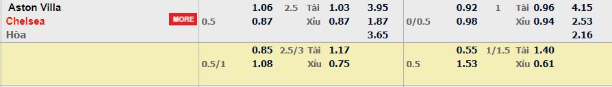 - Mức kèo nhà cái cược chấp trận này: Chelsea chấp 0,5 trái. Aston Villa ăn 1,06. Chelsea ăn 0,87