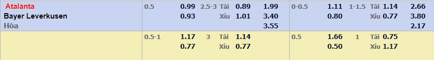 - Mức kèo nhà cái đưa ra trận này: Atalanta chấp 0,5 Trái. Atalanta ăn 0,99. Bayer Leverkusen ăn 0,93