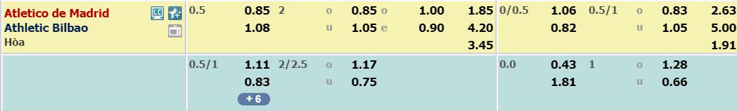 - Mức kèo bóng đá cược chấp nhà cái đưa ra cho cả trận: Atl Madrid chấp 0,5 trái. Atl Madrid ăn 0,85. Ath Bilbao ăn 1,08