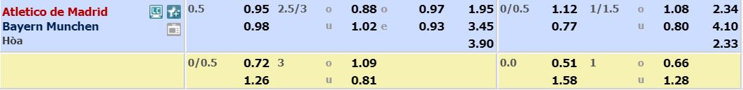- Mức kèo bóng đá cược chấp nhà cái đưa ra cho cả trận: Atl Madrid chấp 0,5 trái. Atl Madrid ăn 0,95. Bayern Munich ăn 0,98