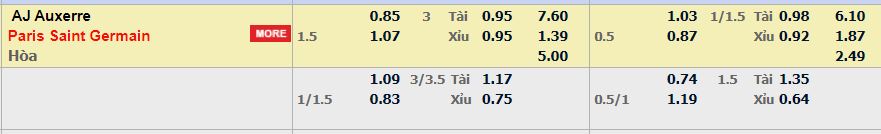 - Mức kèo nhà cái cược chấp trận này: Paris SG chấp 1,5 trái. Auxerre ăn 0,85. Paris SG ăn 1,07