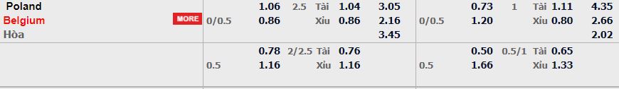- Mức kèo nhà cái cược chấp trận này: Bỉ chấp 0,25 Trái. Ba Lan ăn 1,06. Bỉ ăn 0,86