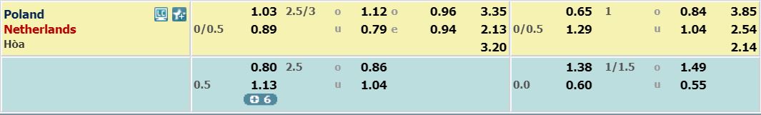 - Mức kèo nhà cái cược chấp trận này: Hà Lan chấp 0,25 trái. Ba Lan ăn 1,03. Hà Lan ăn 0,89