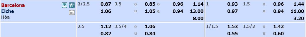 - Mức kèo bóng đá cược chấp nhà cái đưa ra cho cả trận: Barcelona chấp 2,25 Trái. Barcelona ăn 0,87. Elche ăn 1,06.