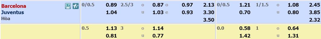 - Mức kèo bóng đá cược chấp nhà cái đưa ra cho cả trận: Barcelona chấp 0,25 trái. Barcelona ăn 0,89. Juventus ăn 1,04