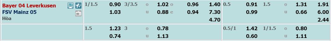 - Mức kèo bóng đá cược chấp nhà cái đưa ra cho cả trận: Bayer Leverkusen chấp 1,25 Trái. Bayer Leverkusen ăn 0,90. Mainz 05 ăn 1,03.