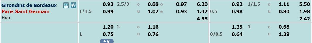 - Mức kèo bóng đá cược chấp nhà cái đưa ra cho cả trận: Paris SG chấp 1,25 Trái. Bordeaux ăn 0,93. Paris SG ăn 0,99.