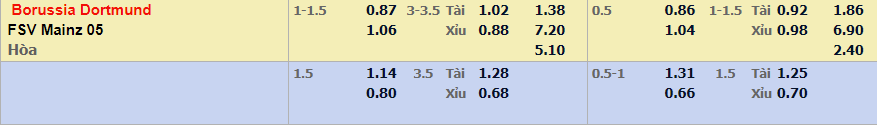 - Mức kèo nhà cái đưa ra trận này: Dortmund chấp 1,25 Trái. Dortmund ăn 0,87. Mainz 05 ăn 1,06