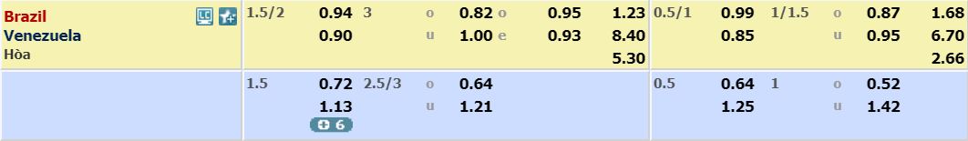 - Mức kèo nhà cái cược chấp trận này: Brazil chấp 1,75 trái. Brazil ăn 0,94. Venezuela ăn 0,90