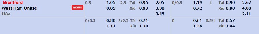 - Mức kèo nhà cái cược chấp trận này: Brentford chấp 0,5 trái. Brentford ăn 1,05. West Ham ăn 0,85