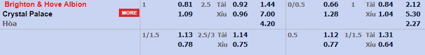 - Mức kèo nhà cái cược chấp trận này: Brighton chấp 1 Trái. Brighton ăn 0,81. Crystal Palace ăn 1,09