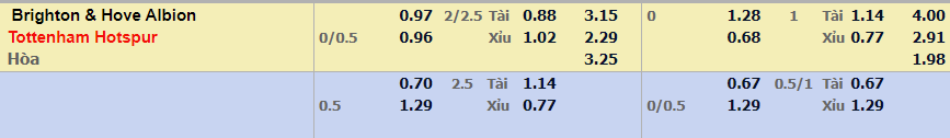 - Mức kèo nhà cái đưa ra trận này: Tottenham Hotspur chấp 0,25 Trái. Brighton ăn 0,97. Tottenham Hotspur ăn 0,96