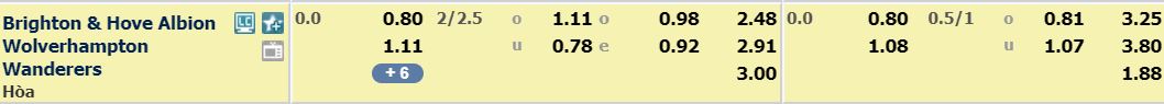 - Mức kèo nhà cái cược chấp trận này: Hòa – Được – Thua. Brighton ăn 0,80. Wolves ăn 1,11