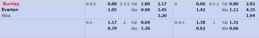 - Mức kèo nhà cái đưa ra trận này: Burnley chấp 0,25 Trái. Burnley ăn 0,88. Everton ăn 1,05
