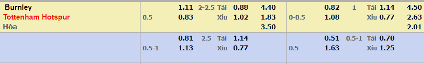 - Mức kèo nhà cái đưa ra trận này: Tottenham Hotspur chấp 0,5 Trái. Burnley ăn 1,11. Tottenham Hotspur ăn 0,83