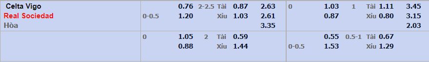- Mức kèo nhà cái đưa ra trận này: Real Sociedad chấp 0,25 Trái. Celta Vigo ăn 0,76. Real Sociedad ăn 1,20