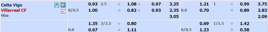 - Mức kèo nhà cái cược chấp trận này: Villarreal chấp 0,25 trái. Celta Vigo ăn 0,93. Villarreal ăn 1,00