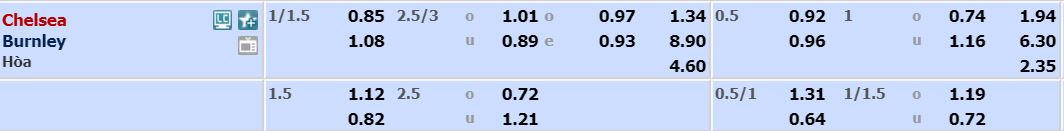 - Mức kèo bóng đá cược chấp nhà cái đưa ra cho cả trận: Chelsea chấp 1,25 Trái. Chelsea ăn 0,85. Burnley ăn 1,08.